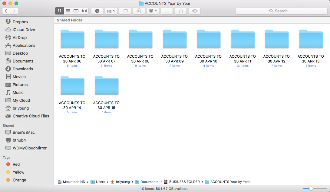 Everything that goes through your business obviously has to be recorded, accounted for, and retained for six years. (unless you’re a hairdresser, grass cutter, window cleaner, plumber etc, – in which case you get to keep everything you earn in hard cash, so don’t need any documentation except the bare minimum, fleece the hell out of the likes of me, but still use all the public services that are paid for by tax receipts such as hospitals, schools etc). Anyway, it’s perfectly acceptable to maintain records as image files as long as they’re legible and accessible. My financial year begins on the 1st May each year, and I denote the period with the prefix FY, and the year in which the period ends – the current one is FY17.