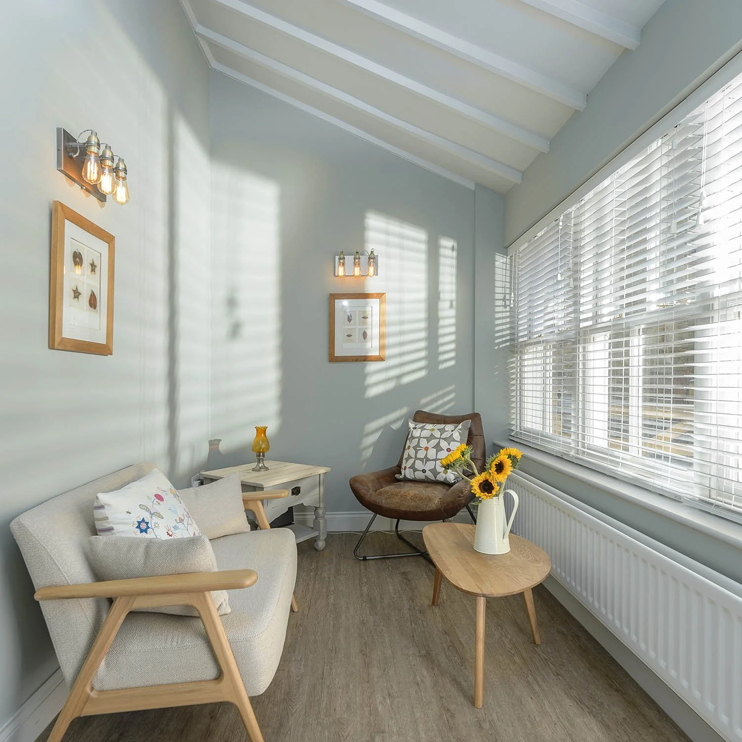 Holiday cottage shoots need to convey the glorious summer sun, but tend to be shot during rubbish weather, so the use of artificial sunshine tends to be frequent. The shot of a garden room extension below would have looked properly drab without a strong directional blast of flash fired through the blinds to give some drama to the final image. Almost any room can be livened up using this simple technique.