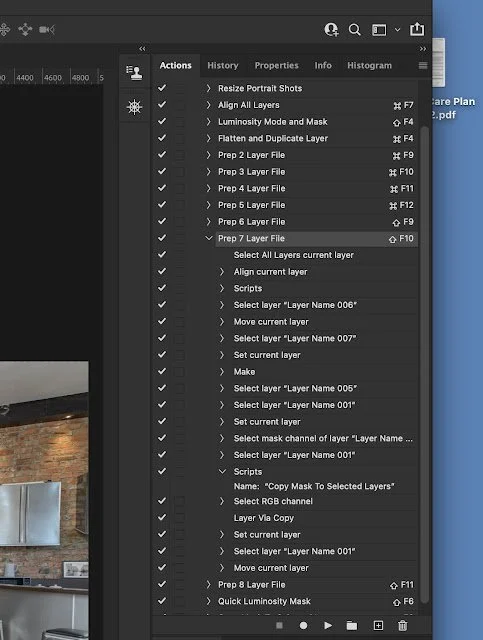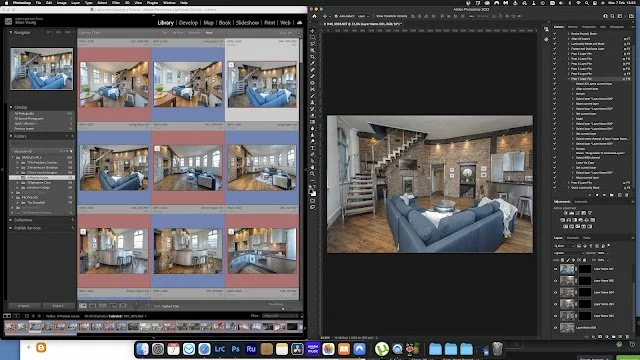All raw images on memory cards are transferred to my high-spec work iMac as soon as I get in - being put into named folders. These are imported into Adobe Lightroom using specific import presets which lift the shadows, reduce the highlights, and correct any distortion. I quickly tag all the frames I'm going to utilise, and check the frames for any tweaks I need to make in terms of exposure. I then group the various frames of each view together. Each group of frames is exported into Adobe Photoshop as a stack of layers, then my automated script renames & reorders the layers, changes blending modes, and creates masks so I can mix the flash exposures and natural light exposure to something that matches my style. Before I developed these scripts and actions, each completed image could take 7 or 8 minutes to process. That's down to less than a minute now. Each completed image is then saved back into Lightroom as a high definition TIF file, a final output preset is applied to add some oomph, and then I do some manual cropping, straightening, and tweaking if need be. Once all images have been finished, they're exported as jpegs into a pictures folder.