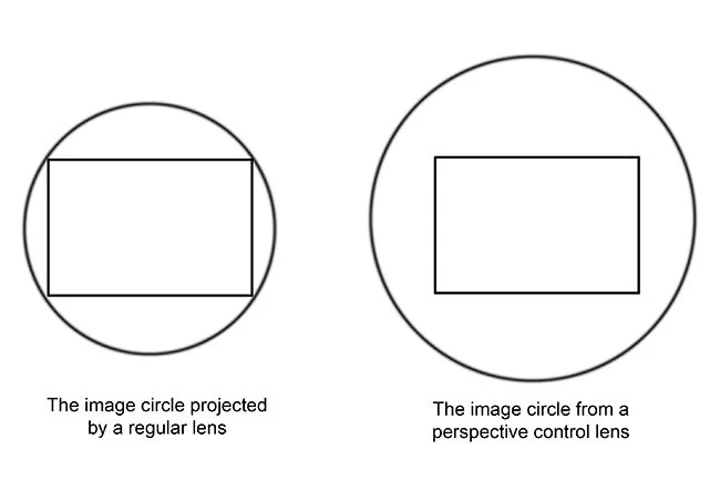 So what makes this weird looking thing so invaluable when photographing interiors, architecture (or products actually)? The lens allows the user to exercise control over certain aspects of the picture taking process that can’t be done with normal lenses. It does this using two principles: A larger projected image circle, and geared movements. The image created by a lens is circular, and it is projected onto a rectangular sensor – as in the left hand side of the illustration below. The right hand side shows how a PC lens works – by creating a bigger image circle. The geared movements allow the lens to move – placing the sensor in different parts of the circle. The main advantage is that instead of having to angle the camera upwards (causing the building or room to lean backwards), I can keep my vertical lines perfectly straight, and move the camera view up and down to include whatever I need to.