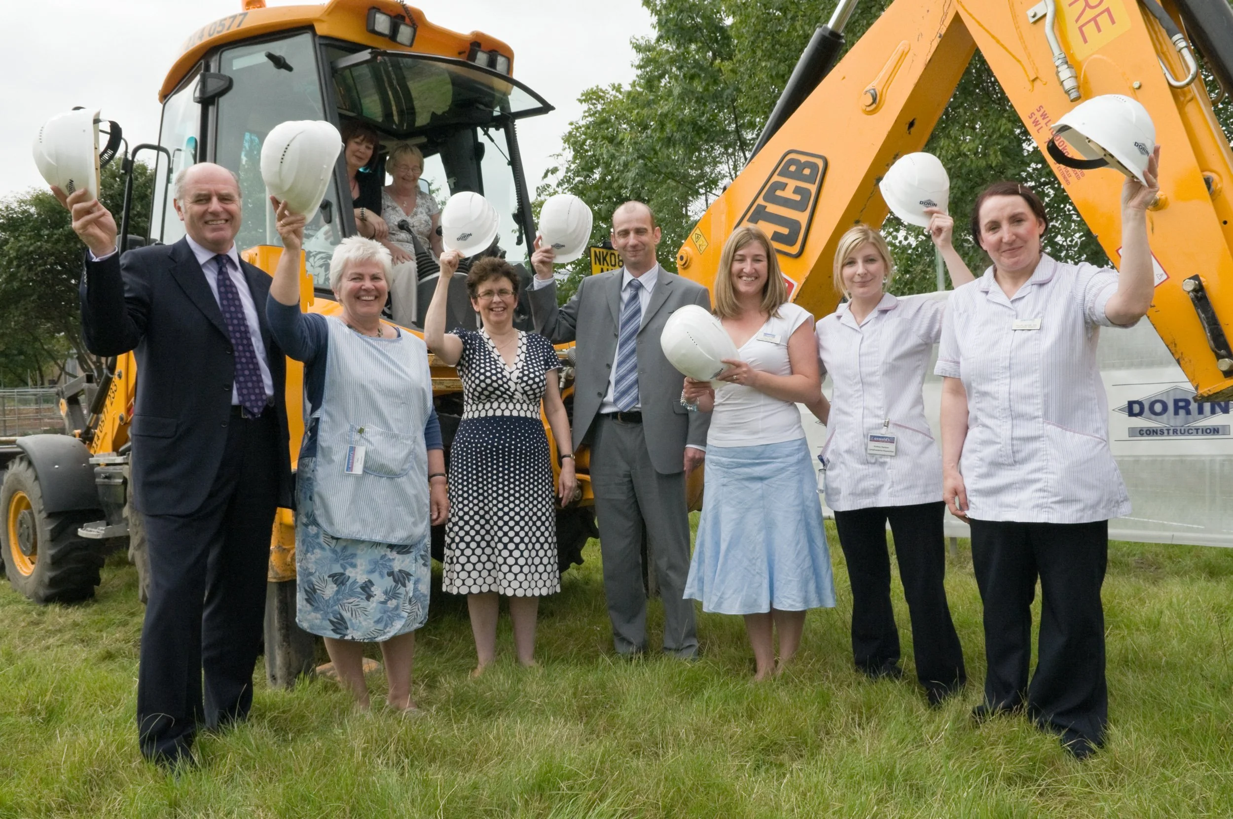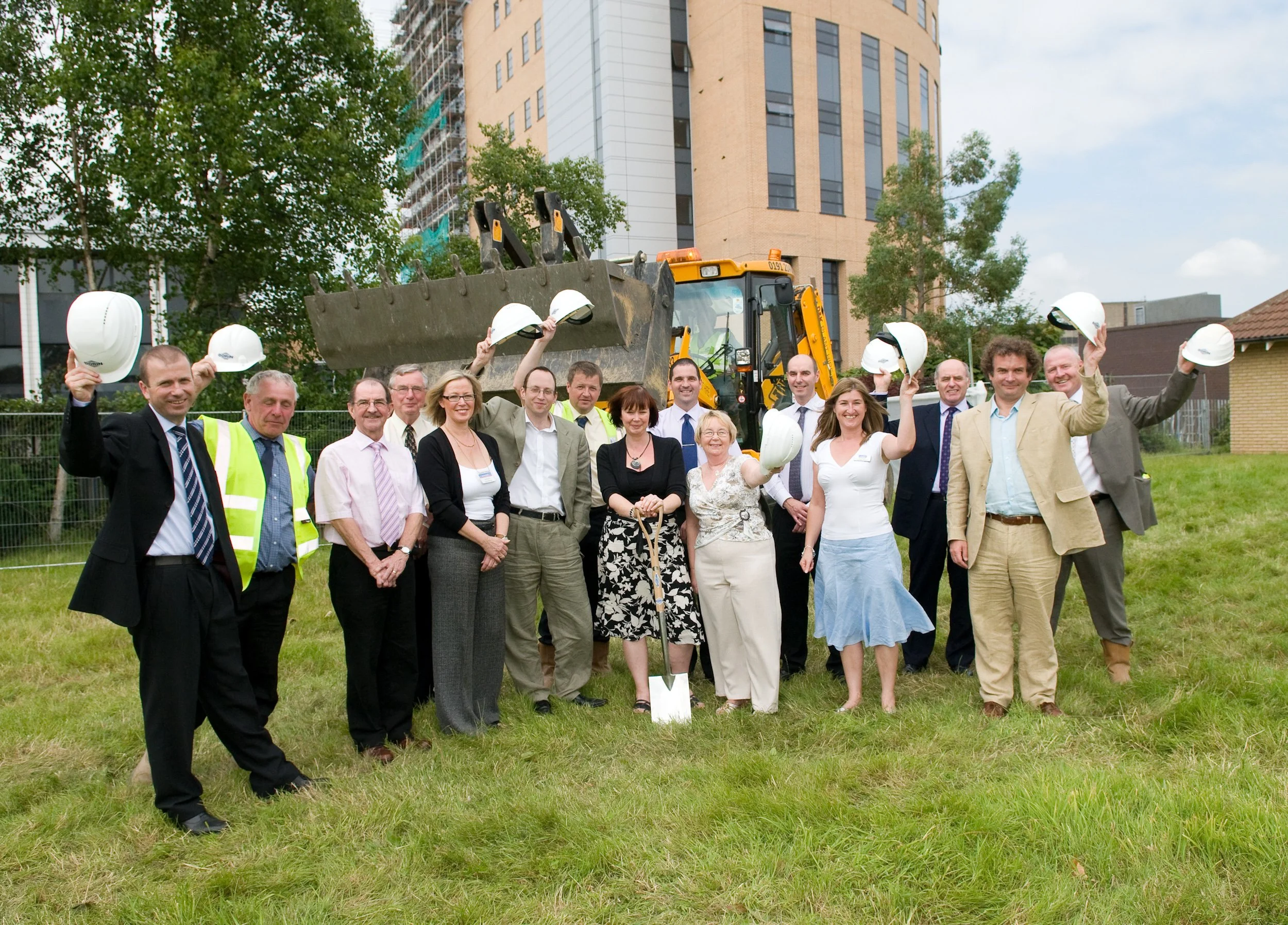 Group of people with construction helmets at a groundbreaking ceremony in front of a digger