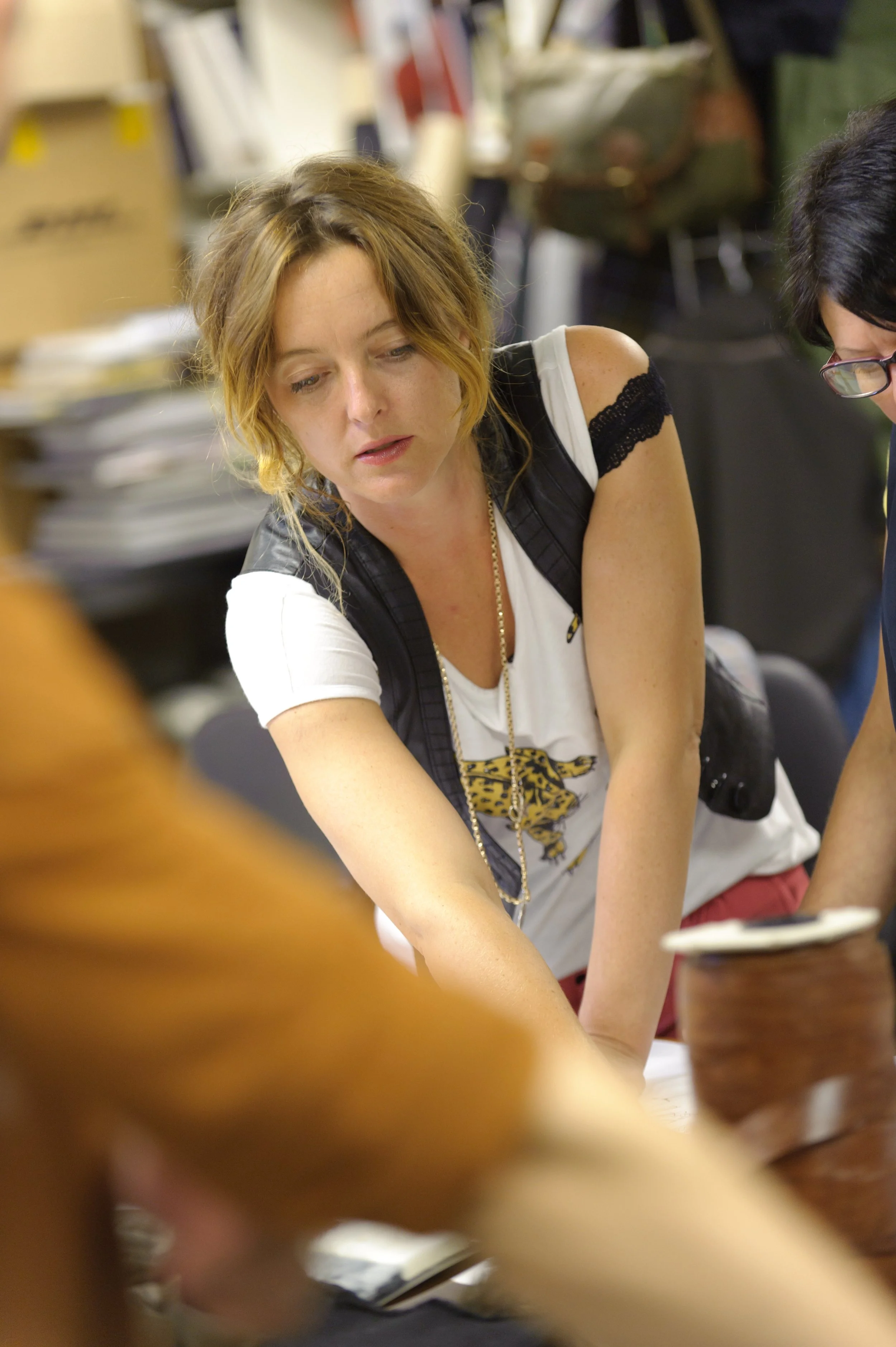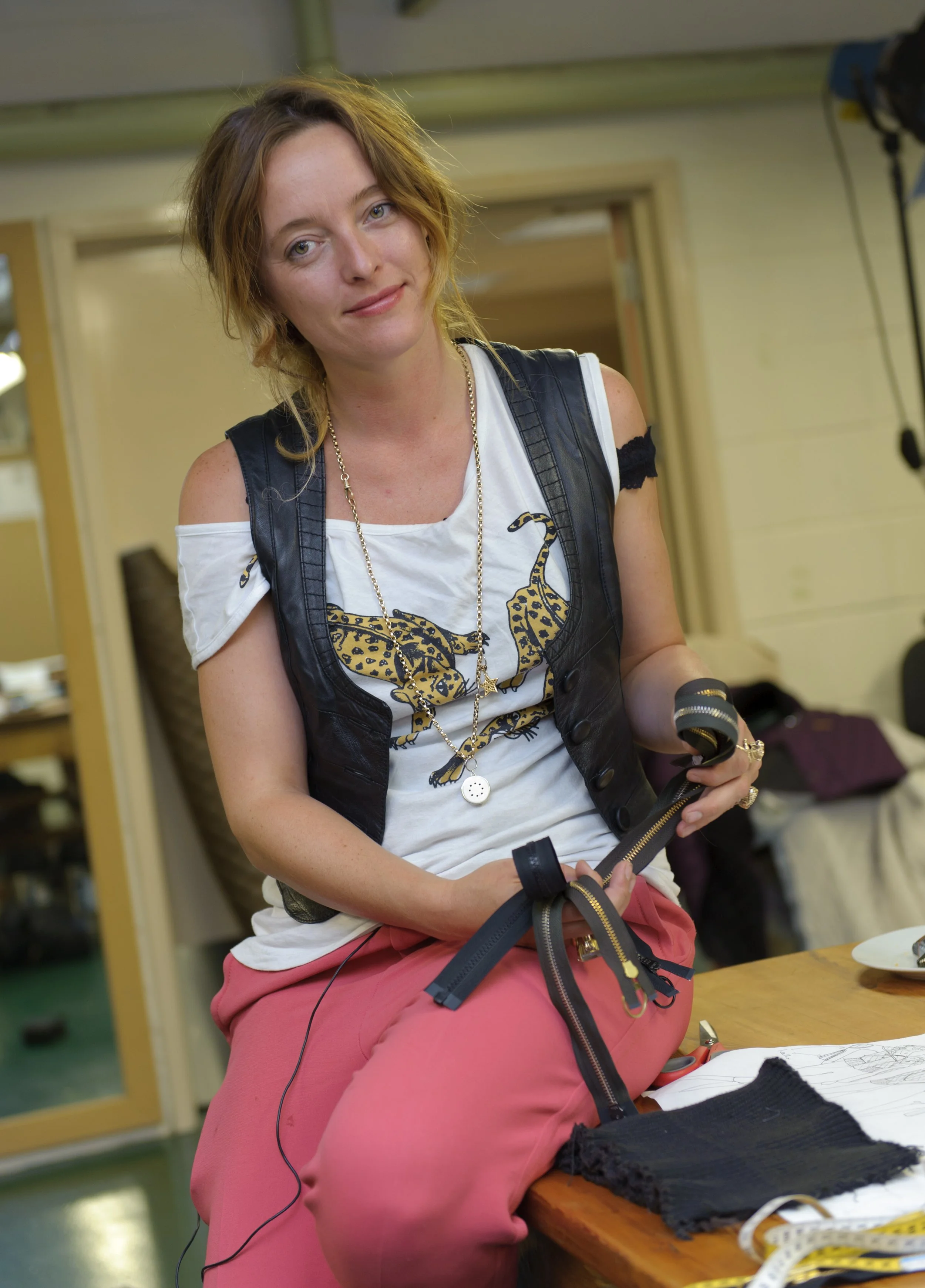 Woman sitting on a table holding zippers, wearing a white shirt with a leopard print, a black leather vest, and pink pants, in a workshop environment. View fullsize