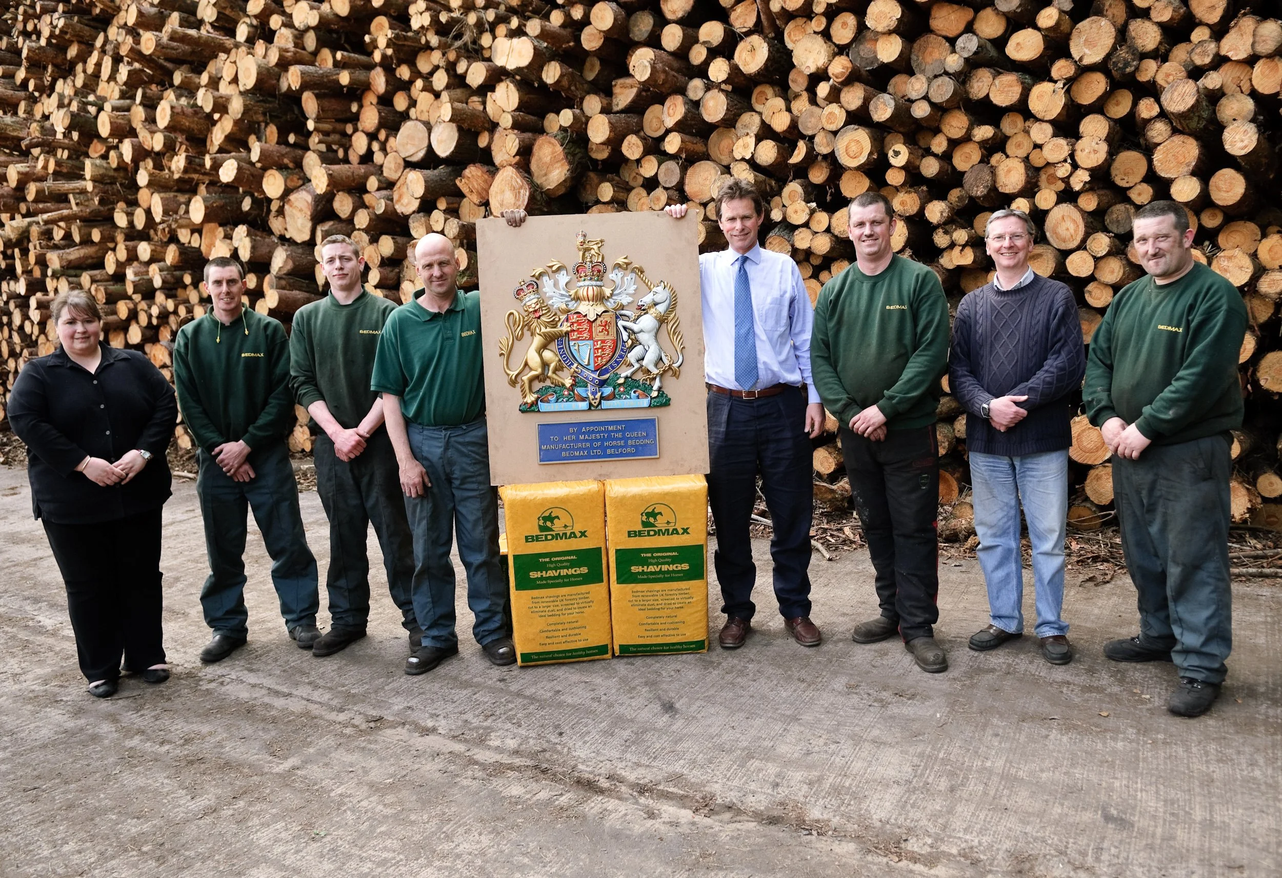 Two men standing in front of stacked logs and yellow Bedmax packaging, one wearing a green Bedmax polo shirt and the other in a suit. View fullsize