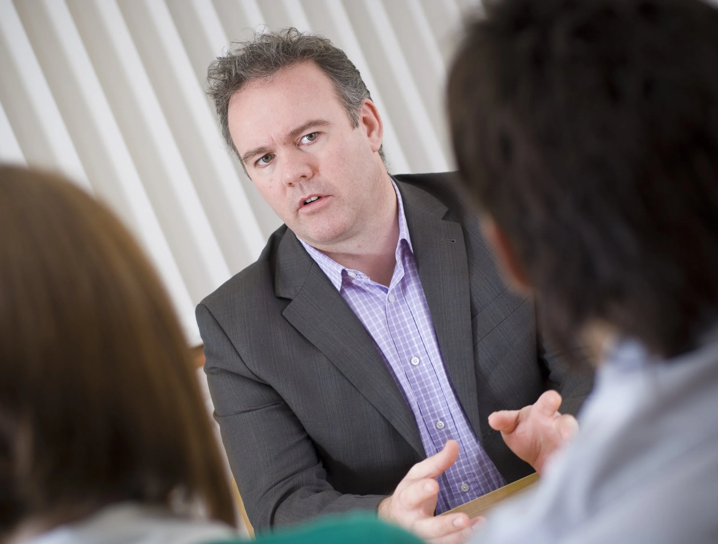 Business meeting with man speaking, wearing suit and purple checkered shirt, seated at table with two blurred figures in foreground.