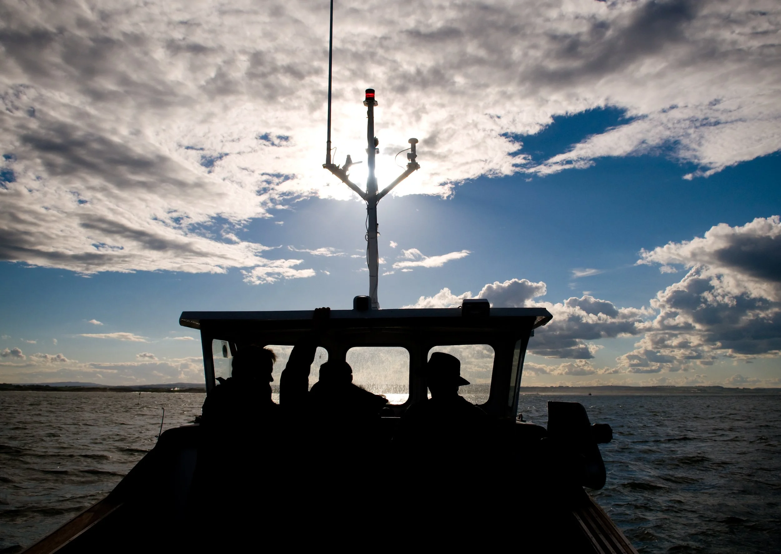 Silhouette of people on a boat against a bright sun, with ocean and cloudy sky in the background.