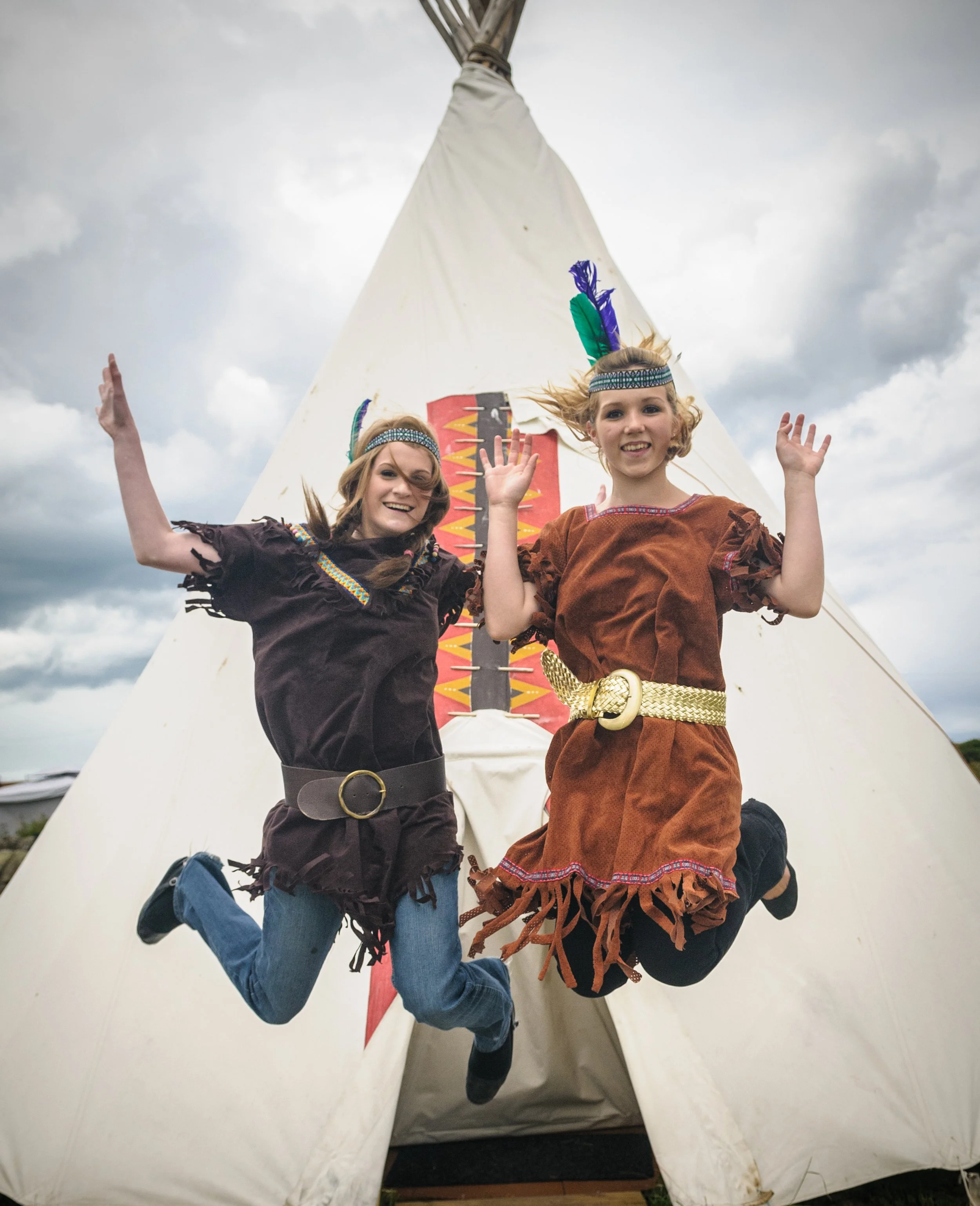 Two people in fringed outfits jump joyfully in front of a teepee, wearing headbands with feathers. View fullsize