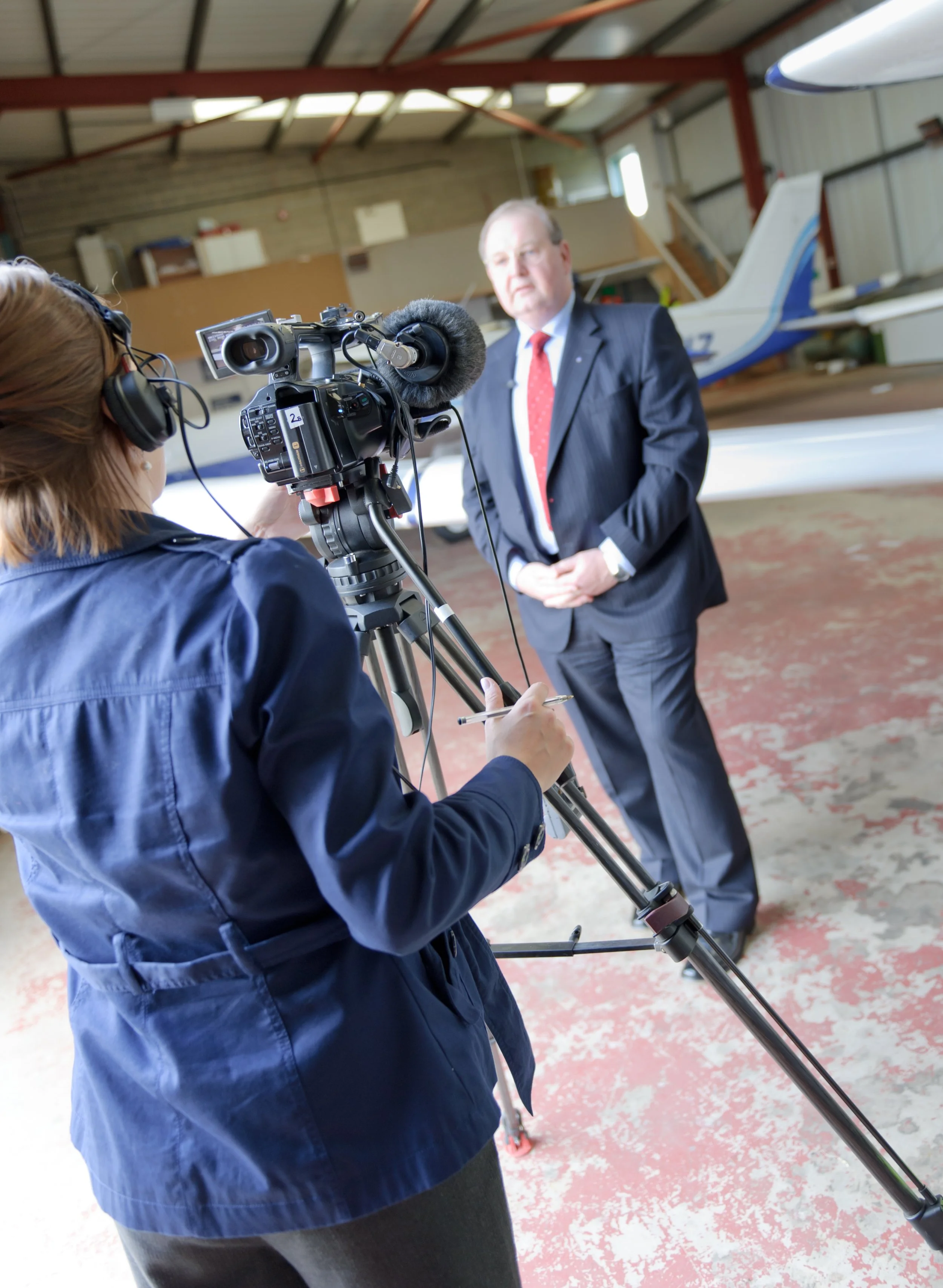 Interview being recorded in an airplane hangar with a man in a suit and a camerawoman using professional equipment. View fullsize