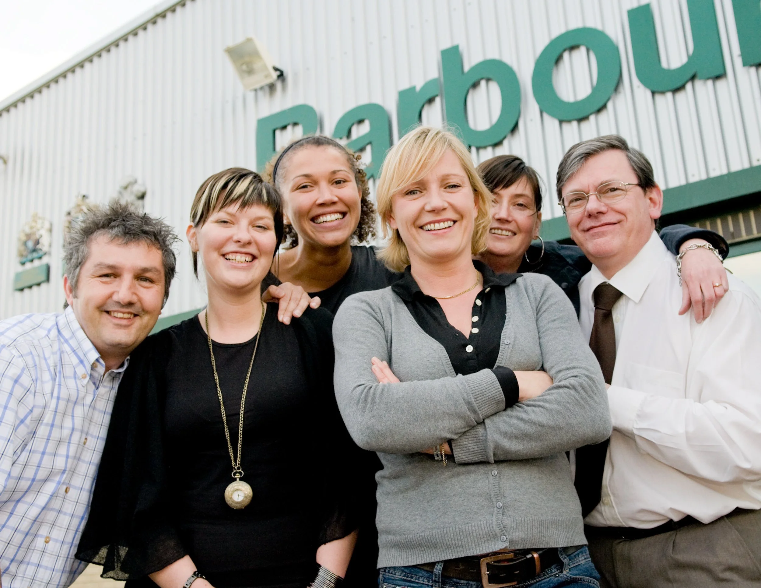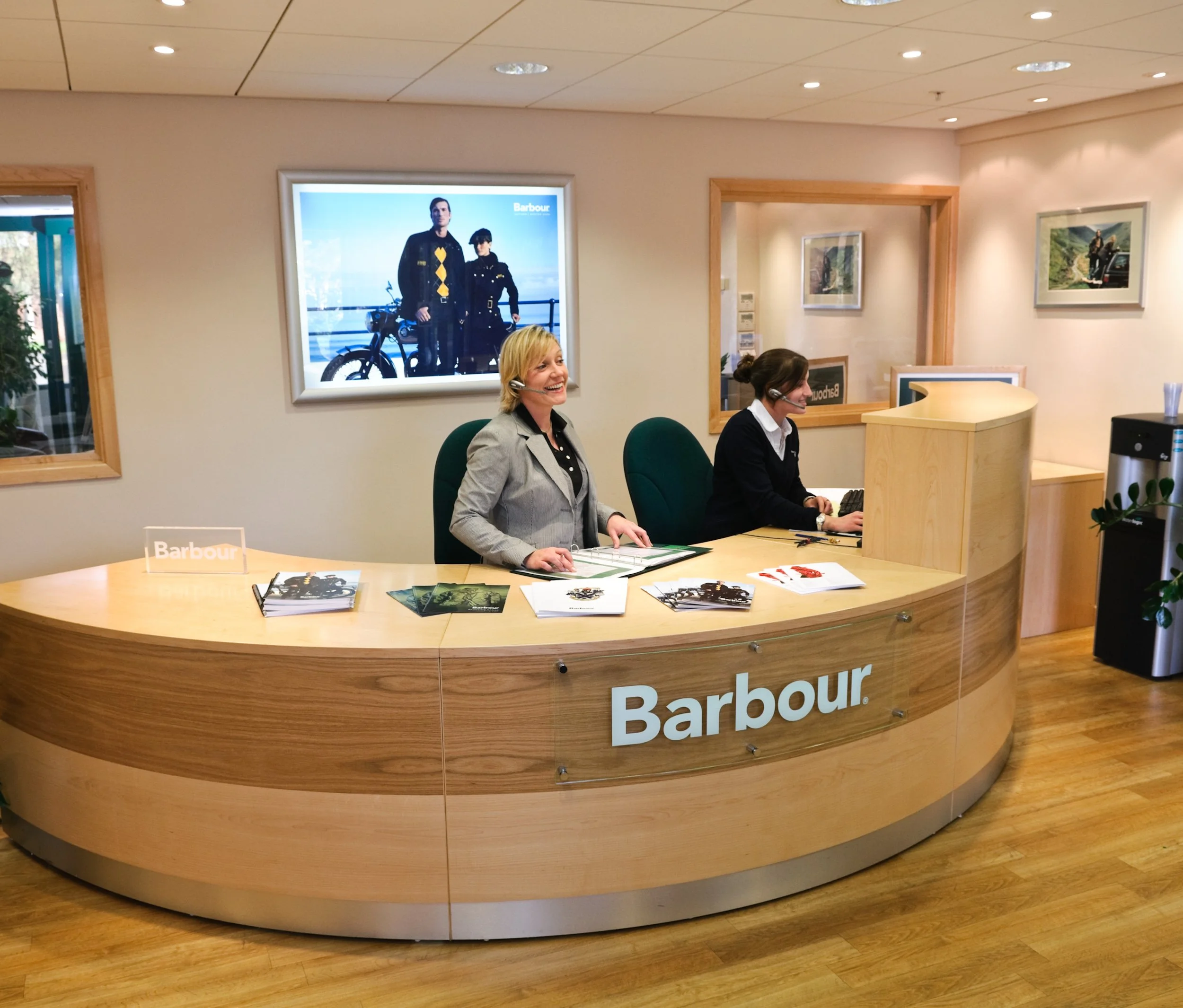 Two women at a reception desk in a Barbour store, one smiling and the other working on a computer, with promotional images and brochures on the desk.