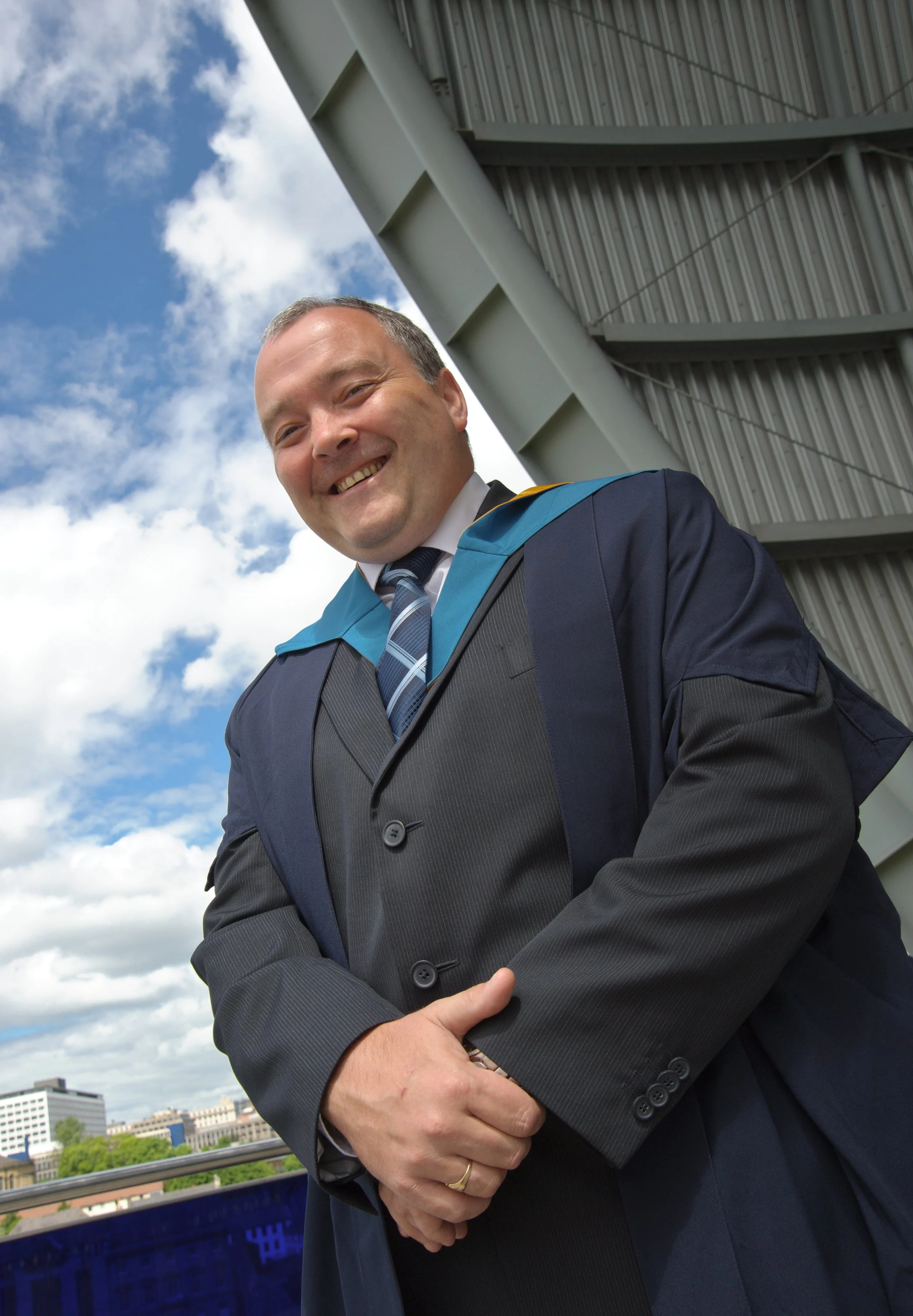 Person in academic regalia standing in front of Sage Gateshead building. View fullsize