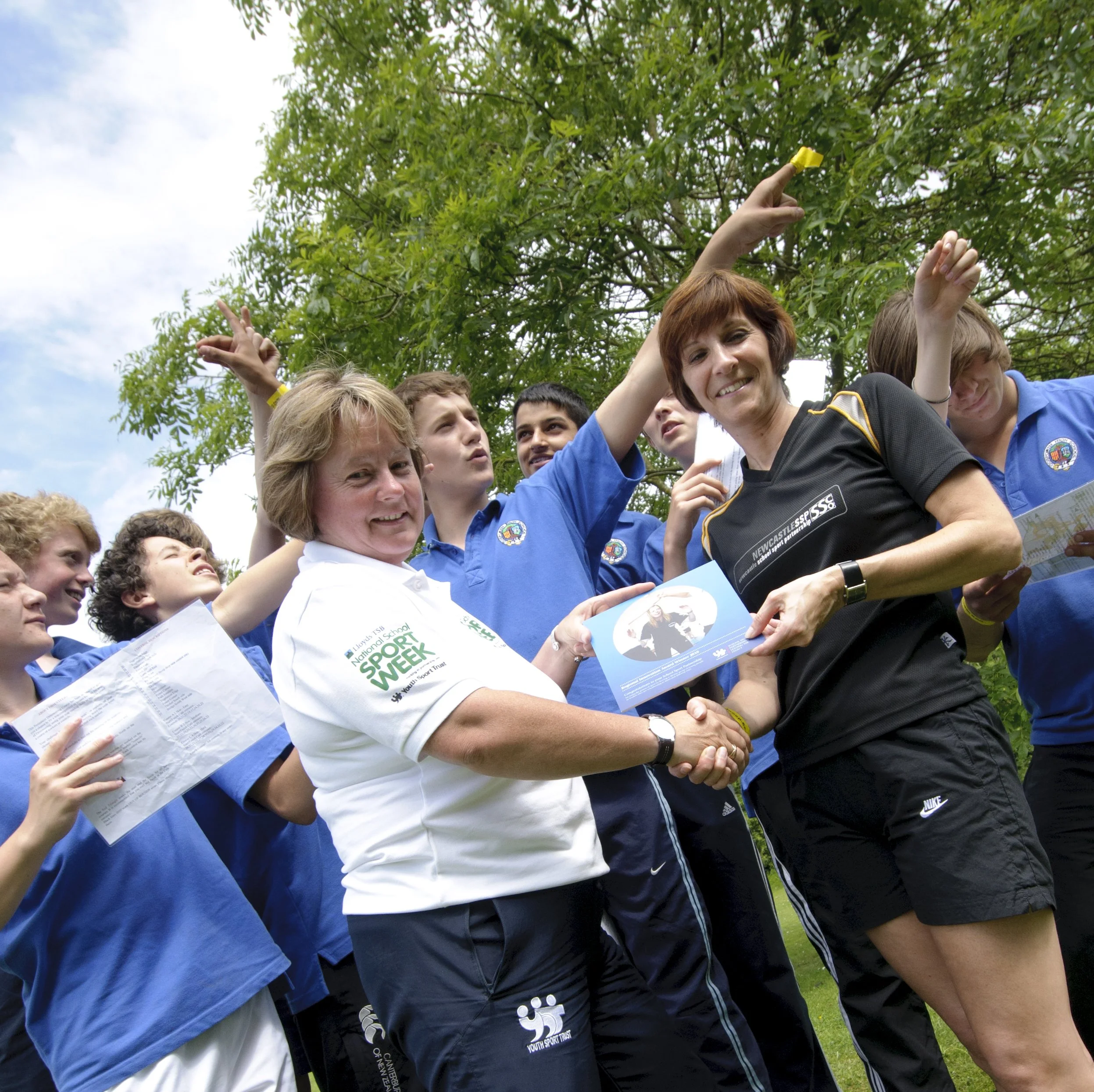 Group of students and two women outdoors, students in blue uniforms, one woman in a white sports shirt, the other in a black sports shirt, shaking hands, trees in the background.