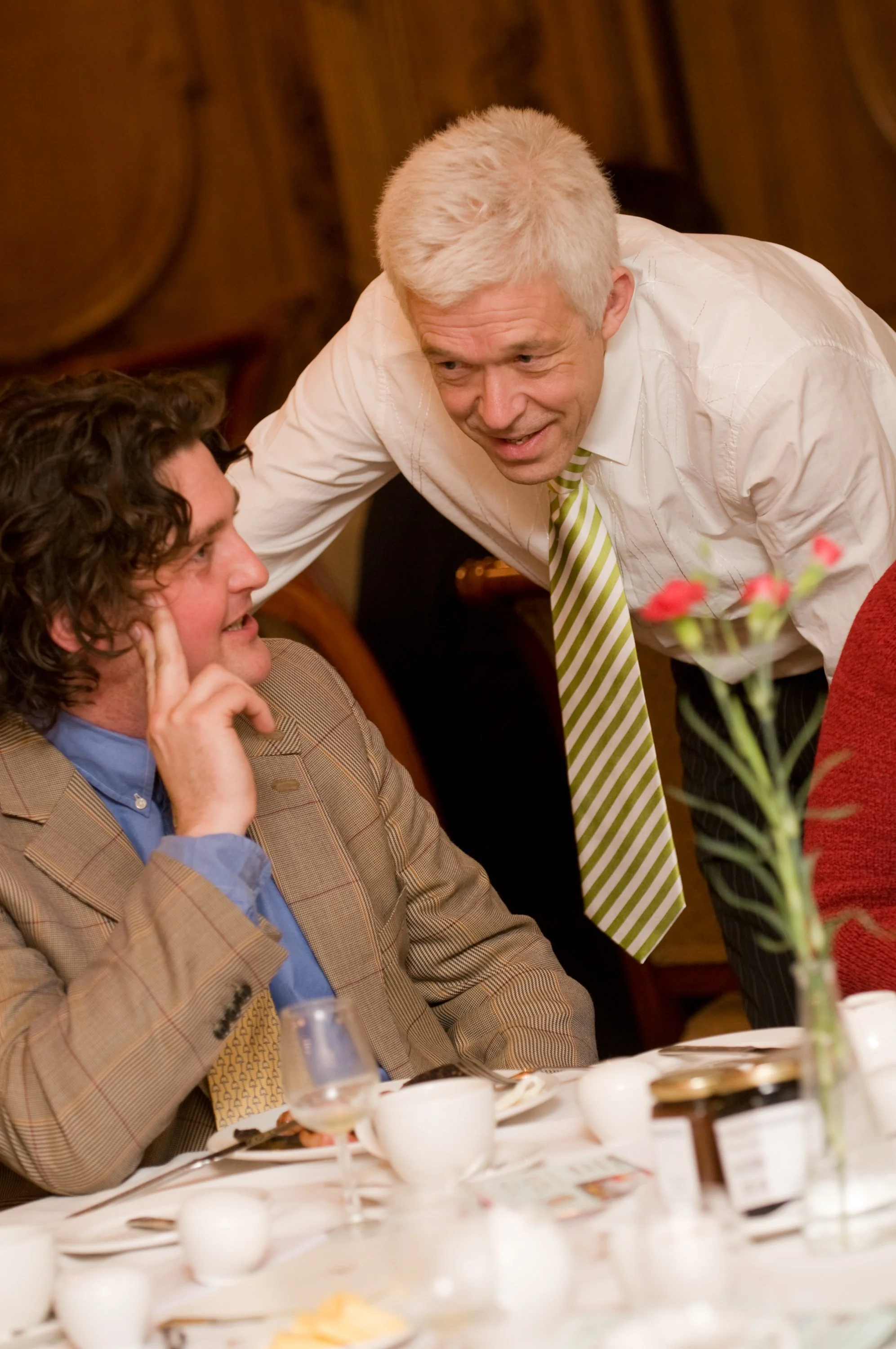 Two men interacting at a formal dining table, one standing and speaking to the seated man.