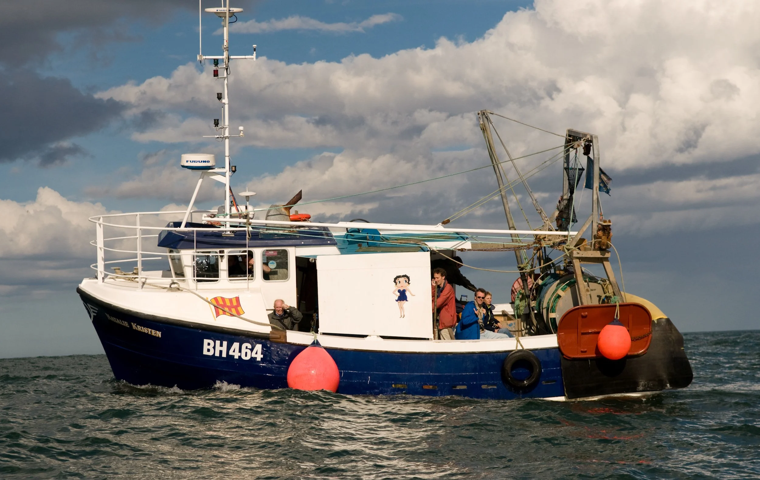 Fishing boat with "BH 464" and Betty Boop decal on side, at sea with multiple crew members on deck.