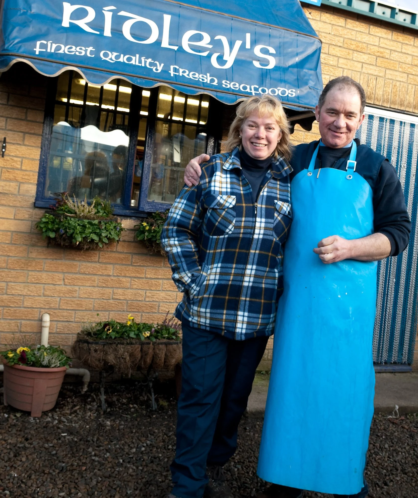 Two people standing outside a seafood shop with a sign saying "Ridley's Finest Quality Fresh Seafoods"