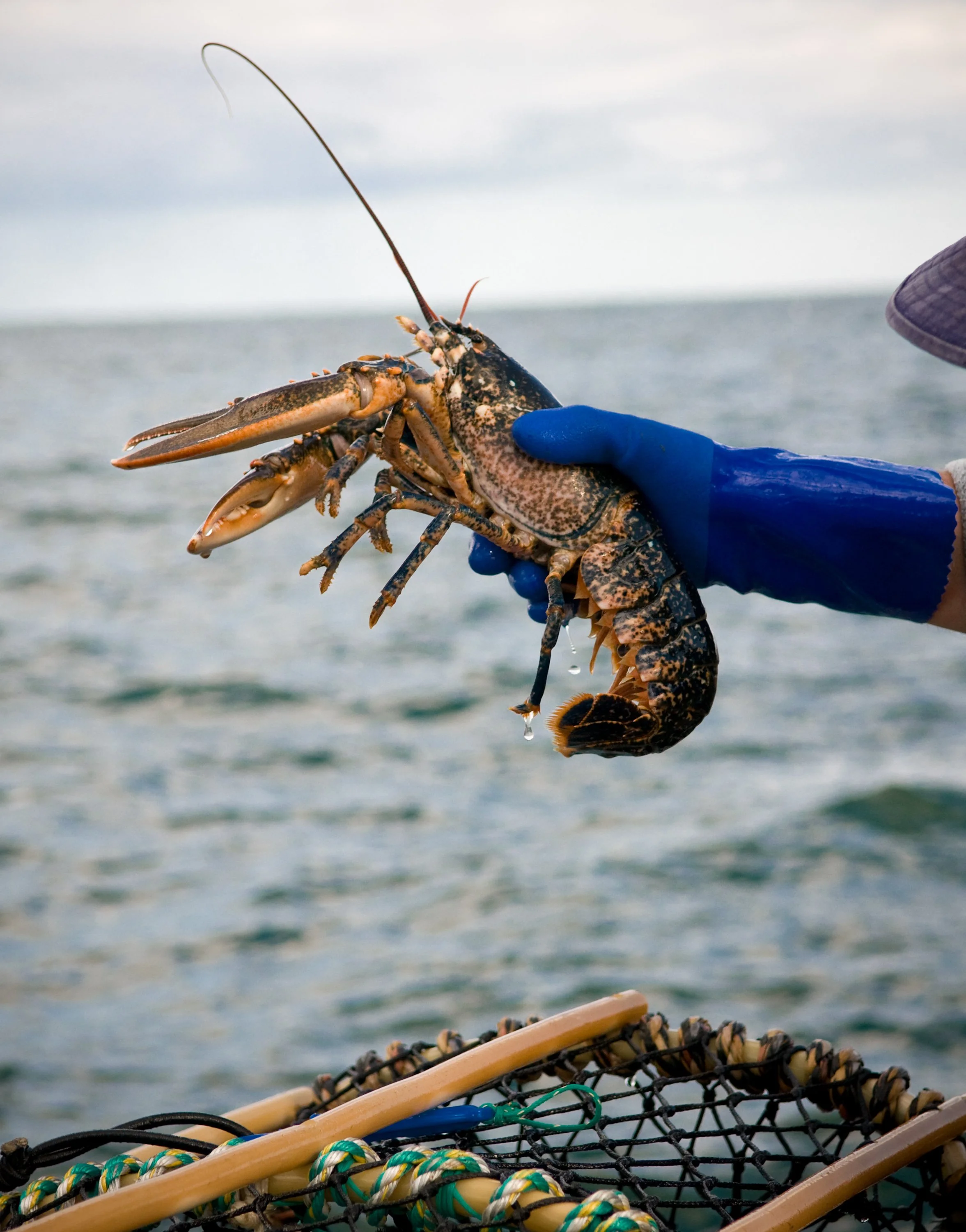 A person wearing a blue glove holding a lobster over a fishing trap with the ocean in the background. View fullsize