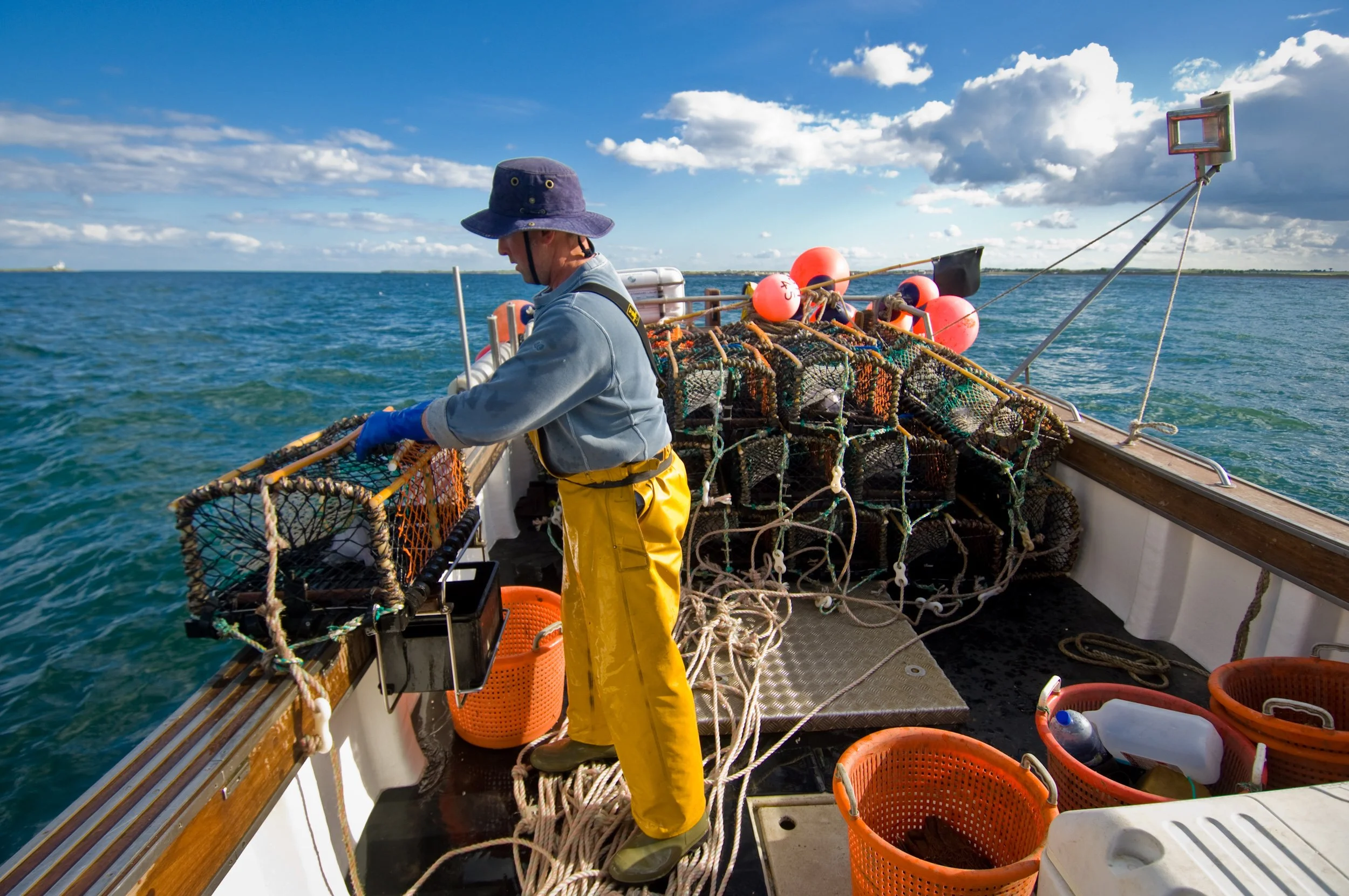 Fisherman on a boat wearing yellow overalls and a blue hat, handling lobster pots, with buoys and the ocean in the background.