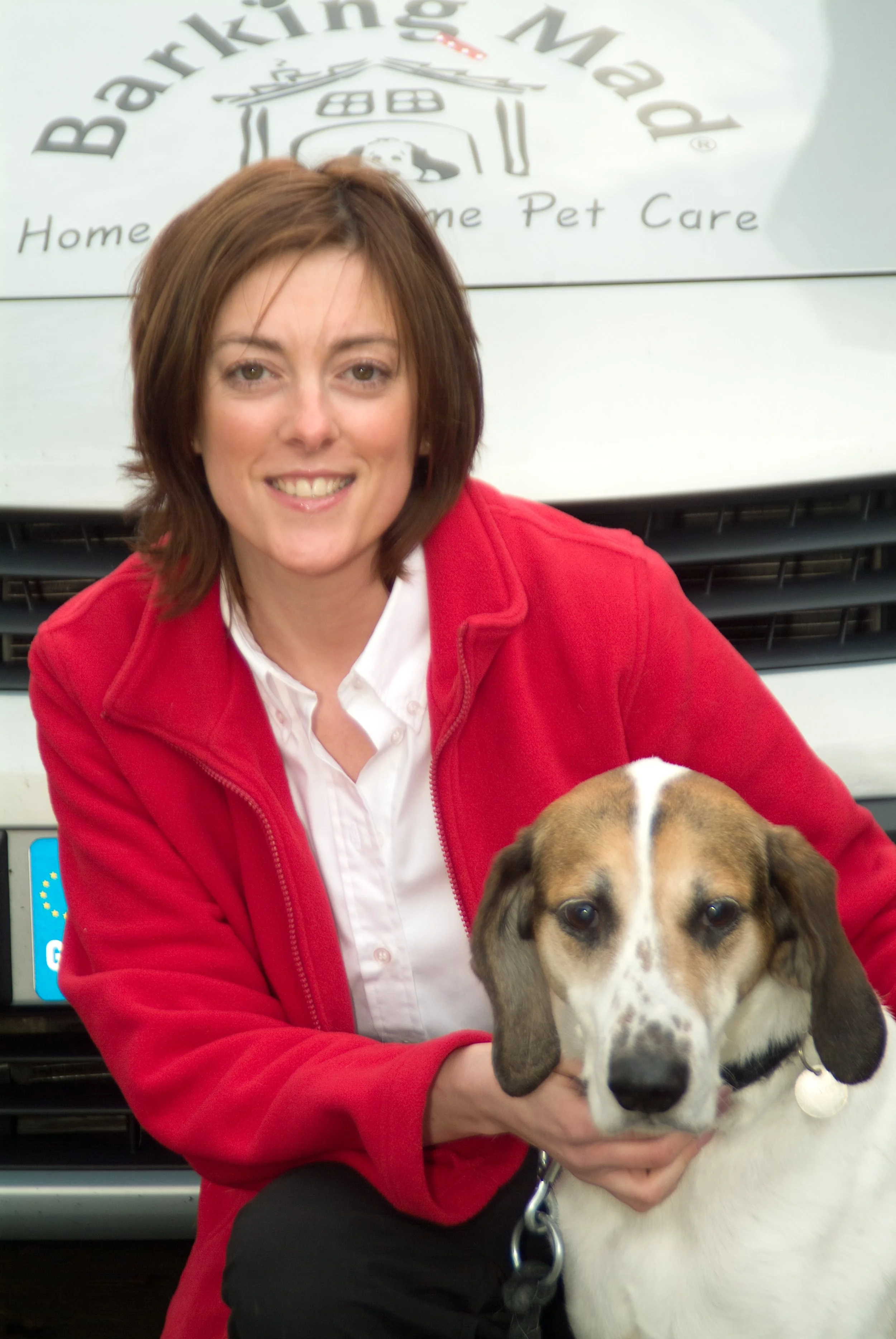 Woman in a red jacket with a dog in front of a pet care van. View fullsize