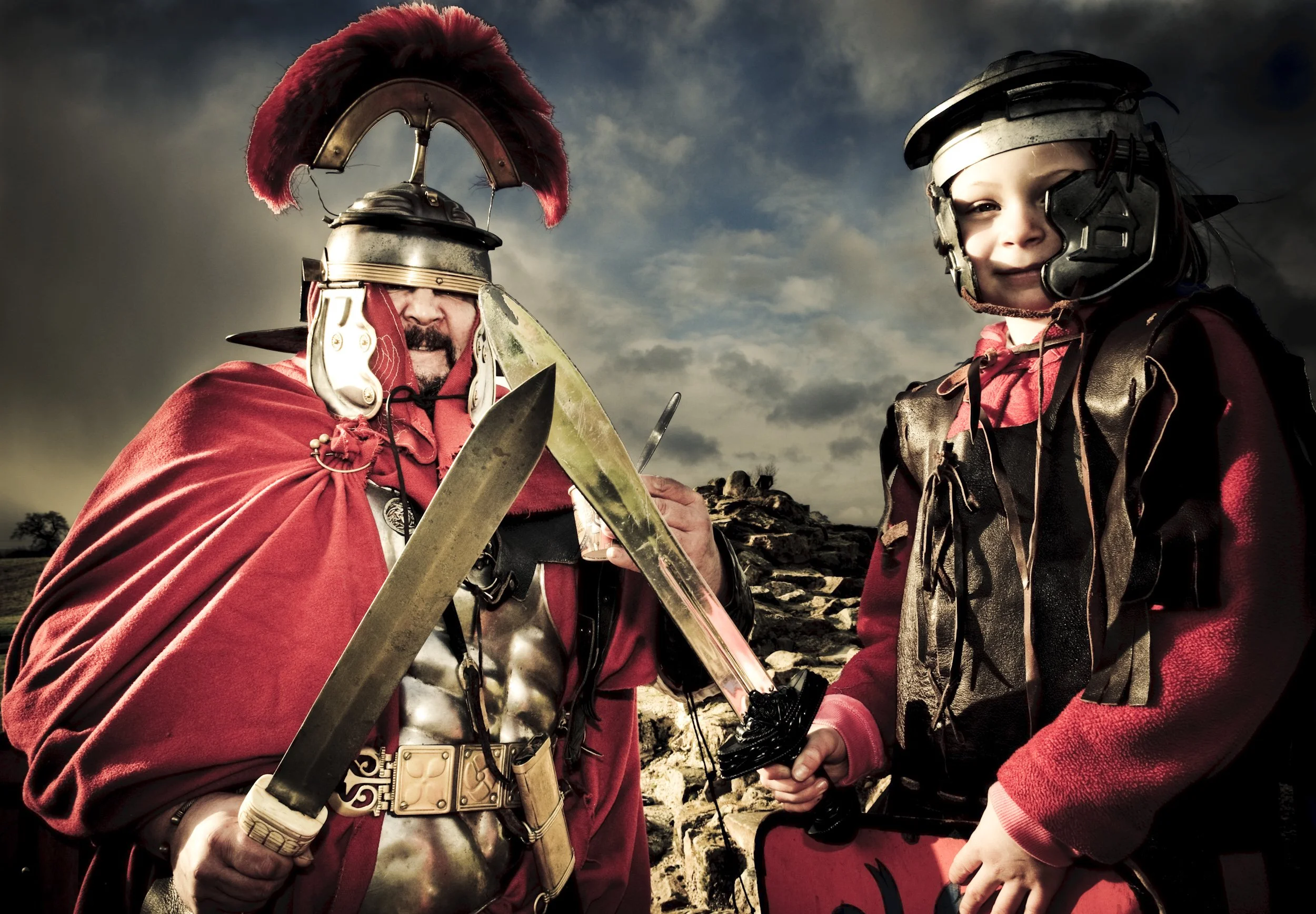 Two people wearing ancient Roman soldier costumes, one adult and one child, holding swords with a cloudy sky in the background.