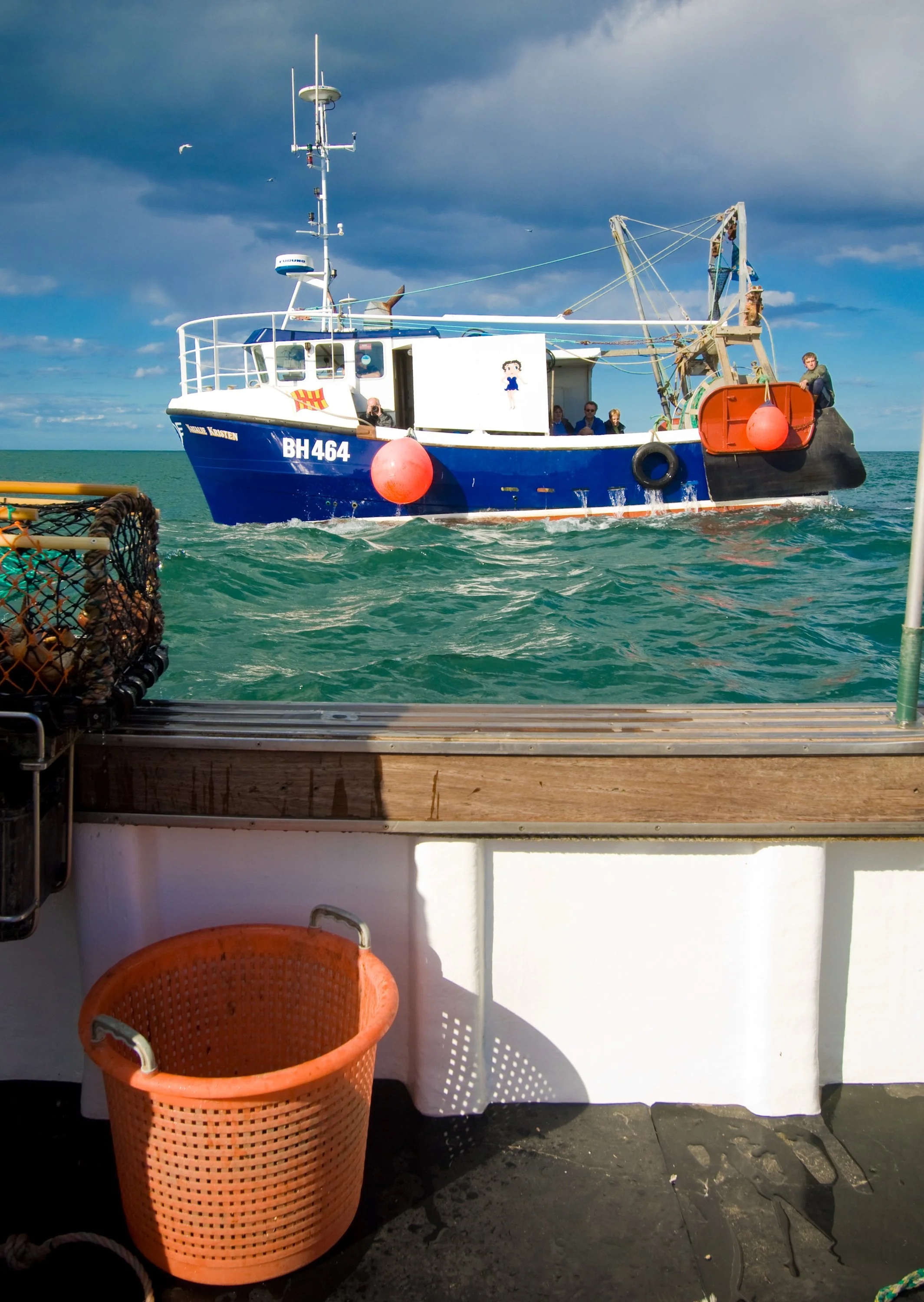 Fishing boat on the sea with a blue hull and red buoys, seen from another boat with a lobster pot and orange basket on deck.