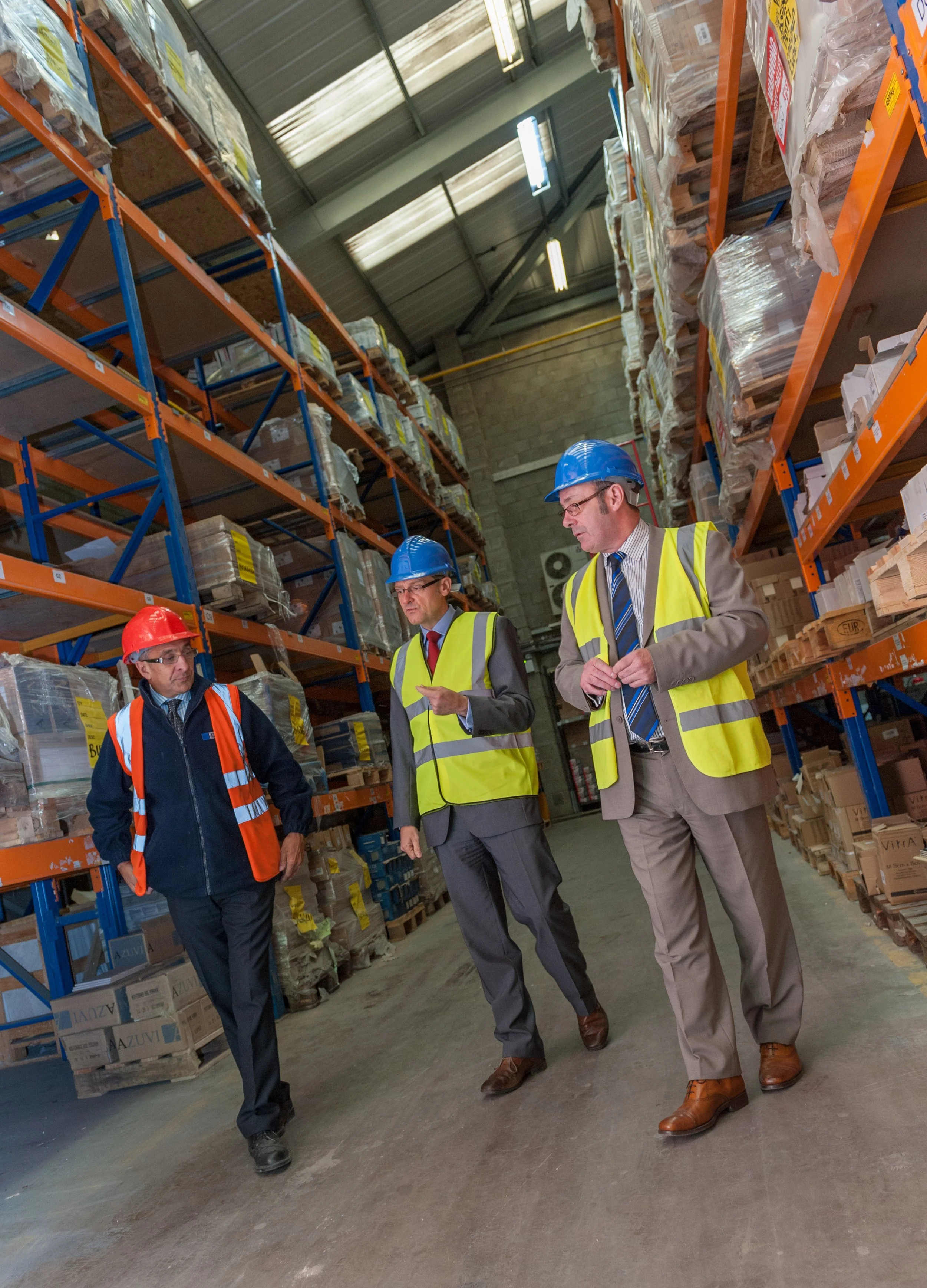 Three men in hard hats and safety vests walking through a warehouse. View fullsize